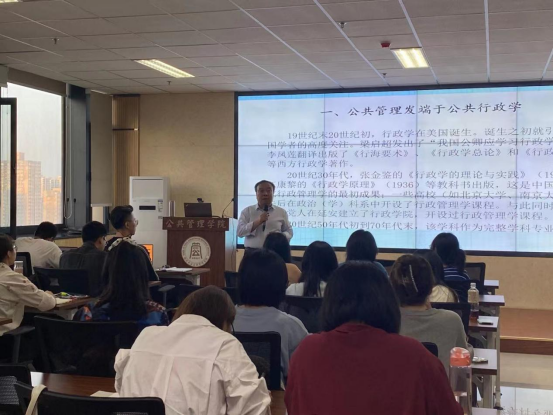 梁忠民教授以妙语连珠的自我介绍开场,先调动起同学们听课的热情,课程在轻松愉悦的氛围中展开。梁教授从公共管理发端于公共行政学、中国公共管理发展的斐然成就、中国公共管理研究的进展与热点和中国公共管理实践的几个重要问题这四个方面对中国公共管理的学科建构与前沿问题展开分析。梁教授首先从中国古代行政管理的发端引入,重点梳理强调了中国近现代公共管理学科的发展。接着,梁教授分析了40年以来中国公共管理学科的发展,他认为中国公共管理学科学术研究成果丰硕,国际影响力不断增强;学科及理论体系建构初见成效;师资队伍发展迅猛;学术交流日趋活跃;学科社会建制逐步成熟;公共管理知识应用日趋广泛。在中国公共管理研究的进展与热点中公共管理的基础性研究、应用性研究、综合性研究和方法论的应用和反思是梁教授讲述的重点。最后,梁教授例举了中国公共管理实践的几个重要问题。