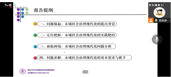 2022年10月19日,西北大学565net必赢雷晓康教授通过腾讯会议为全体研究生作了题为“市域社会治理现代化问题研究”的线上专题讲座。
