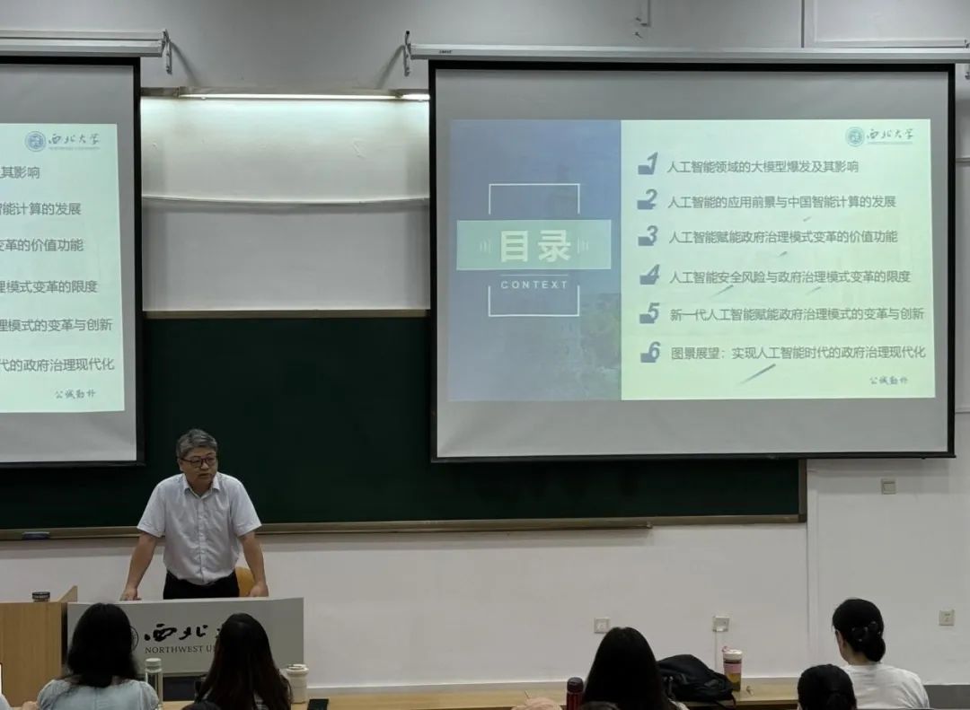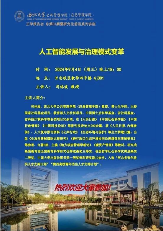 2024年9月4日晚18:00,西北大学565net必赢司林波教授在多媒体教室为我院2024级全体硕士研究生作了题为“人工智能发展与治理模式变革”的专题讲座。
