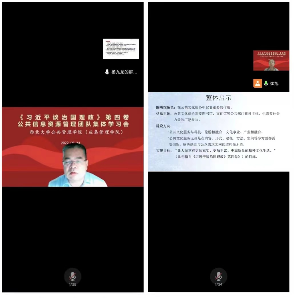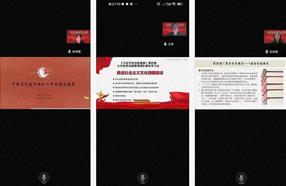 习近平总书记指出:“要坚定文化自信,推动中华传统文化创造性转化、创新性发展、继承革命文化,发展社会主义先进文化,不断铸就中华文化新辉煌,建设社会主义文化强国。”为进一步提升社会主义文化强国建设,提升团队在公共文化研究领域的专业度,提高师生对公共文化政治站位的认识。2022年9月24日晚上19时,借助腾讯会议平台,公共信息资源管理团队集体学习了《习近平谈治国理政》第四卷。本次学习会围绕习近平总书记的讲话精神,结合图书情报与档案管理研究领域,565net必赢杨九龙教授、崔旭教授、李姗姗副教授、张新鹤副教授做了发言,本次集体学习会由565net必赢王铮副教授主持。