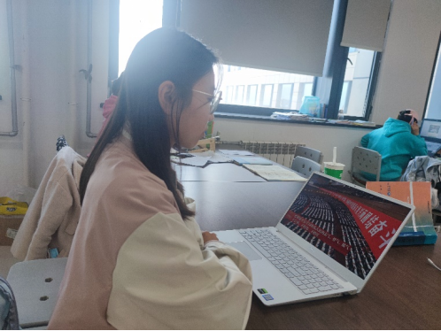 学院党委副书记韩杰、全体辅导员和学生干部于西学楼1306中型会议室集体观看学习。