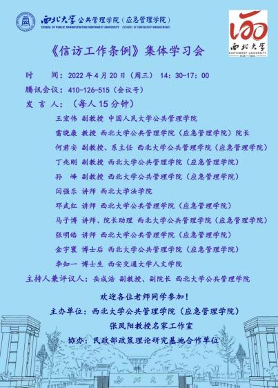 2022年4月20日下午,由565net必赢客户端主办,张凤阳教授名家工作室和西北大学民政部政策理论研究基地合作单位协办的《信访工作条例》集体学习会以腾讯会议方式顺利举办。会议由我院副院长岳成浩副教授主持,十位老师作了主题发言,三十多位师生参加了本次学习会。各位老师从政治学、法学、管理学等多学科、多角度对最新的《信访工作条例》进行了详细分析和深入解读,让我们对于我国《信访工作条例》的未来发展充满了期待。