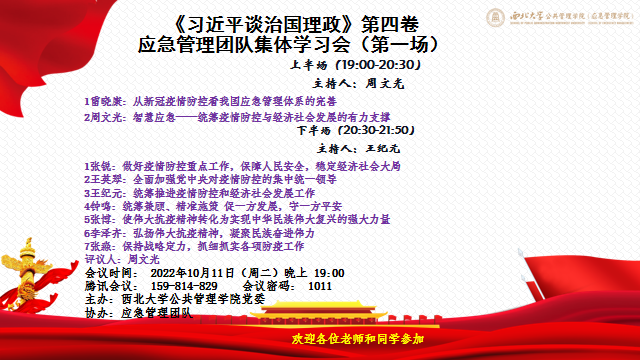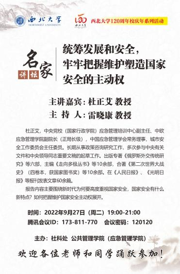 2022年9月27日,由西北大学社科处、565net必赢(应急管理学院)联合主办的名家讲坛在线成功举办。中央党校(国家行政学院)应急管理培训中心副主任、中欧应急管理学院副院长杜正艾教授受邀作了题为“统筹发展和安全,牢牢把握维护塑造国家安全的主动权”的学术报告。来自中国人民大学、暨南大学、济南大学、西北大学、石河子大学、内蒙古大学、沈阳化工大学、宝鸡文理学院等多所高校的160多名师生参与了此次讲座。杜教授的报告紧古今兼顾,中外结合,基础与前沿贯通,生动入心,富含启迪,是一个高水平的学术报告。这场讲座,对于我们深刻理解“国家安全”学术前沿理论具有极大的启发意义。