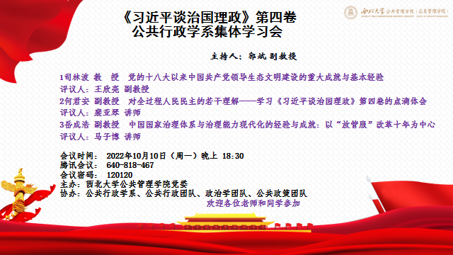 2022年9月底10月初,我院公共行政学系、社会保障学系、信息资源管理学系、人力资源管理系、公共政策与管理系等各个系与学科团队分别举行了《习近平谈治国理政》第四卷集体学习研讨会,与会师生从各自学科角度畅谈了学习收获,加深了对《习近平谈治国理政》第四卷内容和精神的理解。