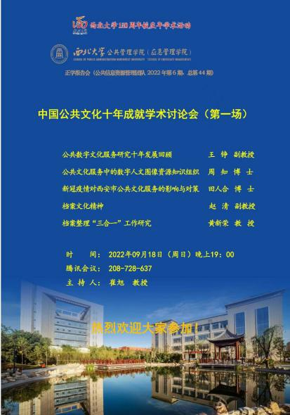 2022年9月18日晚7时,565net必赢客户端于线上开展“中国这十年”中国公共文化十年成就学术讨论会,各位教师和博士研究生先后进行了《公共数字文化服务研究十年发展回顾》、《公共文化服务服务中的数字人文图像资源知识组织》、《新冠疫情对西安市公共文化服务的影响与对策》、《档案文化精神》、《档案整理“三合一”工作研究》的主题报告分享,内容丰富,能够启发与会嘉宾对我国公共文化事业的十年成就、发展现状与未来进路进行更深层次的思考。