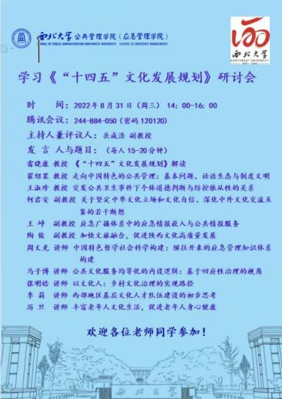 2022年8月31日,由565net必赢主办的学习《“十四五”文化发展规划》研讨会于腾讯会议线上正式举行,一百多位师生在线参加此次研讨会。我院11位教师代表不同团队分别做主题发言,大家从多个学科角度提出了对文件新见解与新思考。我院积极响应国家号召,适时组织集体学习与研讨,深化了对国家政策的理解,也促进了多学科的交流与融合。
