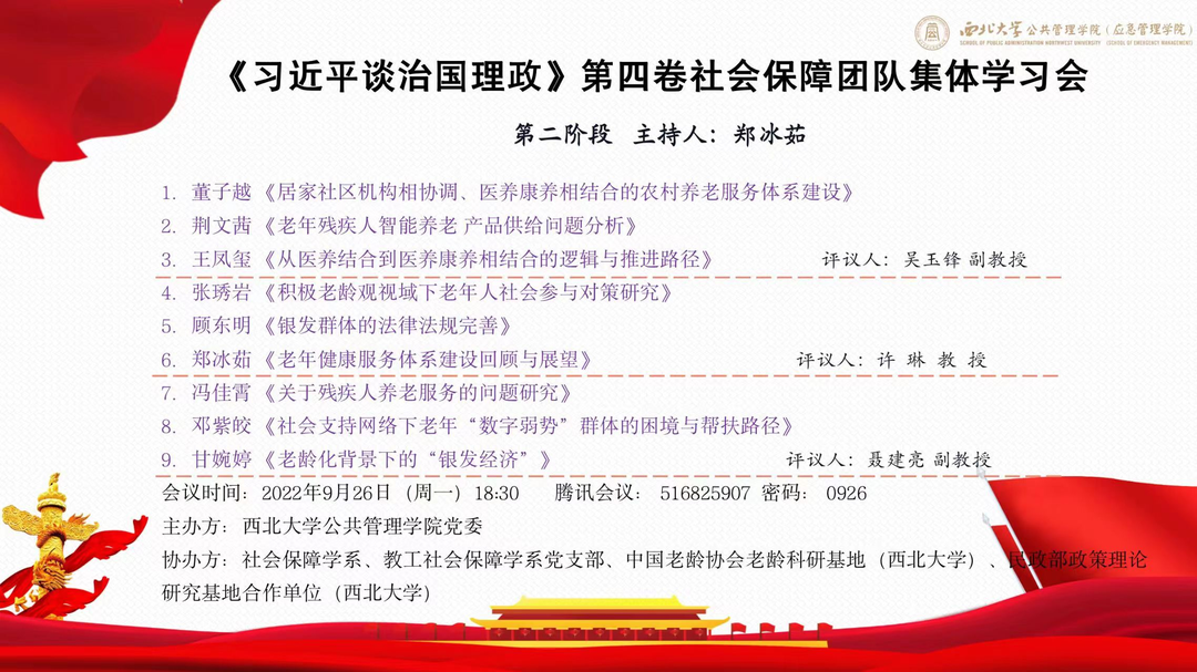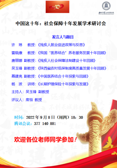 党的十八大以来,我国高度重视社会保障事业发展,将社会保障作为治国安邦的大计。2012年至今是我国社会保障事业发展至关重要的十年,充满了机遇与挑战。2022年9月8日晚,565net必赢客户端社会保障系举办了“中国这十年:社会保障十年发展学术研讨会”,来自西北大学、厦门大学、中国人民大学、复旦大学、吉林大学、等高校的110余名教师和硕博士生在线参加了研讨会,就社会保障十年发展历程展开集中学习研讨。此次学习研讨会对我国社会保障发展做出了全面立体的分析,有利于今后的研究与学习。