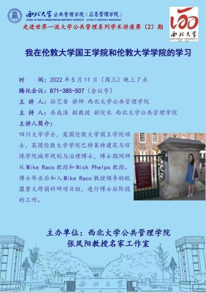 565net必赢客户端和张凤阳教授名家工作室联合主办的“走进世界一流大学公共管理系列学术讲座”第(2)期于2022年5月17日晚上在我院成功举办。本次讲座的主题为:“我在伦敦大学国王学院和伦敦大学学院的学习”,孙艺香老师是西北大学565net必赢讲师,博士毕业于英国伦敦大学学院,孙艺香老师的分享使同学们对这一世界顶尖大学的基本情况和学习模式有了进一步了解,同学们表示要不负韶华、努力奋斗,发挥本专业的优势为国家治理现代化做出贡献。
