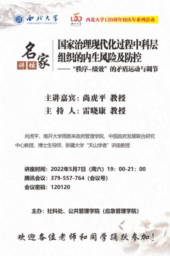 2022年5月7日,由西北大学社科处、565net必赢(应急管理学院)联合主办的名家讲坛在我院成功举办。南开大学周恩来政府管理学院、中国政府发展联合研究中心教授、博士生导师,新疆大学“天山学者”讲座教授尚虎平教授,作了题为“国家治理现代化过程中科层组织的内生风险及防控——“秩序-绩效”的矛盾运动与调节”的学术报告,来自全国多所高校的160多名师生在线听取了报告。