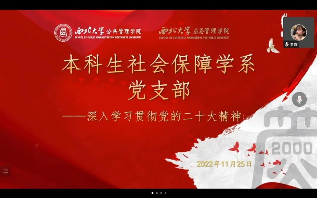 2022年11月25日,本科生社会保障学系党支部举办了“学习党的二十大,永远跟党走”为主题的党日活动,党支部书记杨琬钰同志主持,全体党员参与。