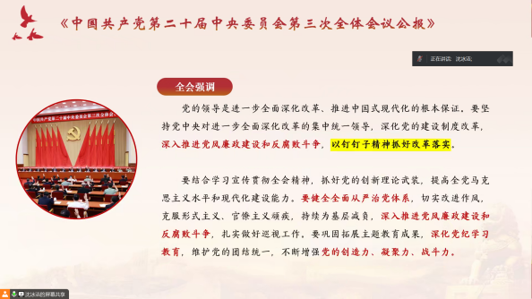 研究生联合党支部书记沈冰洁同志带领支部党员学习宣传贯彻党的二十届三中全会精神,组织支部党员学习了《中国共产党第二十届中央委员会第三次全体会议公报》核心内容,并就支部党员学习宣传贯彻党的二十届三中全会精神提出要求。沈冰洁同志特别强调全会提出的“以钉子精神抓好改革落实”,这一重要指示不仅是对国家层面改革工作的深刻要求,更是我们每一位研究生党员在科研与生活中的重要指引。作为研究生党员,我们要在科研与生活中发扬钉子精神,以更加饱满的热情、更加坚定的信念、更加扎实的作风投入到学习和工作中去。此外,全会还强调要“深化党纪学习教育”,这一强调不仅与全面从严治党的战略布局紧密相连,也与我们本次会议的主题形成呼应,凸显了党纪学习教育在加强党的建设、提升党员素质方面的重要性。
