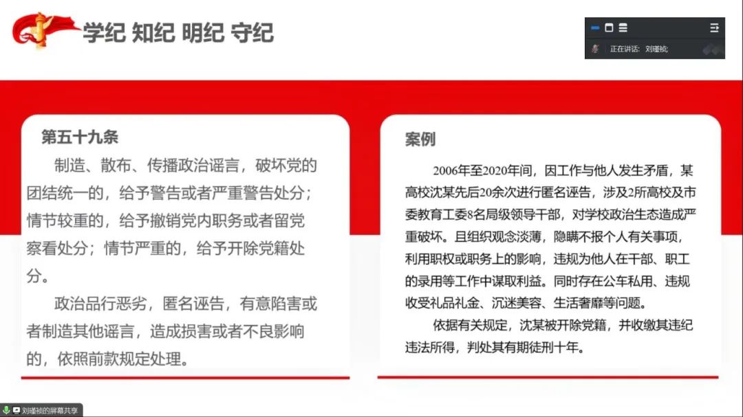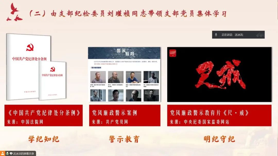 研究生联合党支部纪检委员刘瑾祯同志按照“学纪筑基、知纪明界、明纪定向、守纪促行”的思路,采用“理论联系实际”的学习方法,带领支部党员集中学习了《中国共产党纪律处分条例》,并结合警示教育案例剖析了党员违反政治纪律的行为及其处分。刘瑾祯同志指出我们应反思警示教育案例中所存在问题的根源,要始终把党规党纪挺在前面,以违法违纪案件为鉴,深刻汲取教训,加强自我检视,严守纪律底线,做党章党规党纪的尊崇者、执行者。最后,播放党风廉政警示教育片《尺·戒》,进一步强化了党员们对纪律规矩的敬畏之心,确保支部党员都能严格遵守党的纪律,做到心有所畏、言有所戒、行有所止。