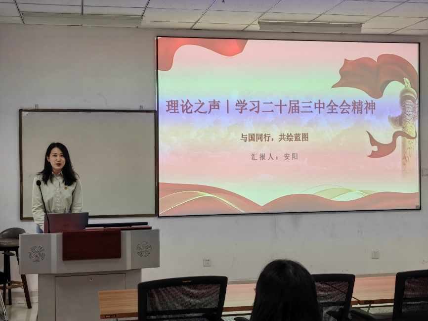 会议第二项议程中,研究生社会保障学系党支部书记安阳结合自己的专业知识和学习见解,为与会人员带来了主题为“学习贯彻党的二十届三中全会精神”的专题分享。安阳同志首先对党的二十届三中全会的核心议题和重大决策进行了全面梳理,通过深入浅出的解读,与会人员对会议精神有了更加清晰的认识。她从专业角度出发对会议精神进行了深刻剖析并倡导大家加强理论学习,提高自身政治理论水平。