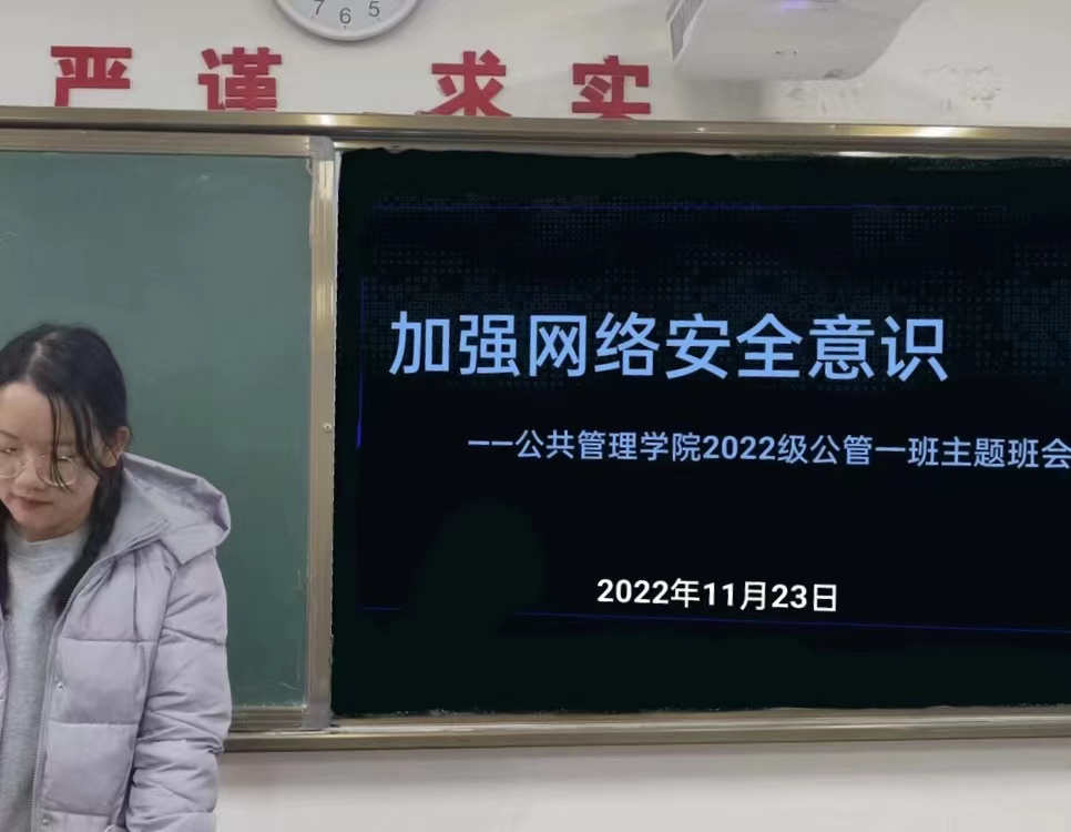 为提高同学们的网络安全意识,增强个人责任感,公管二班于11月23日下午在1104教室举办“网络安全教育”主题班会。宣传委员惠敏婕从网络行为及特点、具体案例以及网络行为准则三个方面为大家进行讲解。她提到“网络行为与我们的生活是息息相关的,互联网已被全面应用在大学生的学习、工作和生活之中,因此要格外重视网络的正向特点与负向特点。”同时,她介绍了网络对大学生的双面影响,提醒大家不要沉溺于虚拟的网络世界而逃避现实社会的责任与义务。随后,相关案例的讲解警示了大家要增强明辨是非的能力,提高警惕,树立正确的价值观,做有礼貌、有道德、有底线的新时代网民。最后,惠敏婕同学就遵守网络行为准则提出建议,希望大家不信谣、不传谣,警惕网络骗局与危害、自觉抵制腐朽文化、宣扬真善美、严格遵守法律法规。