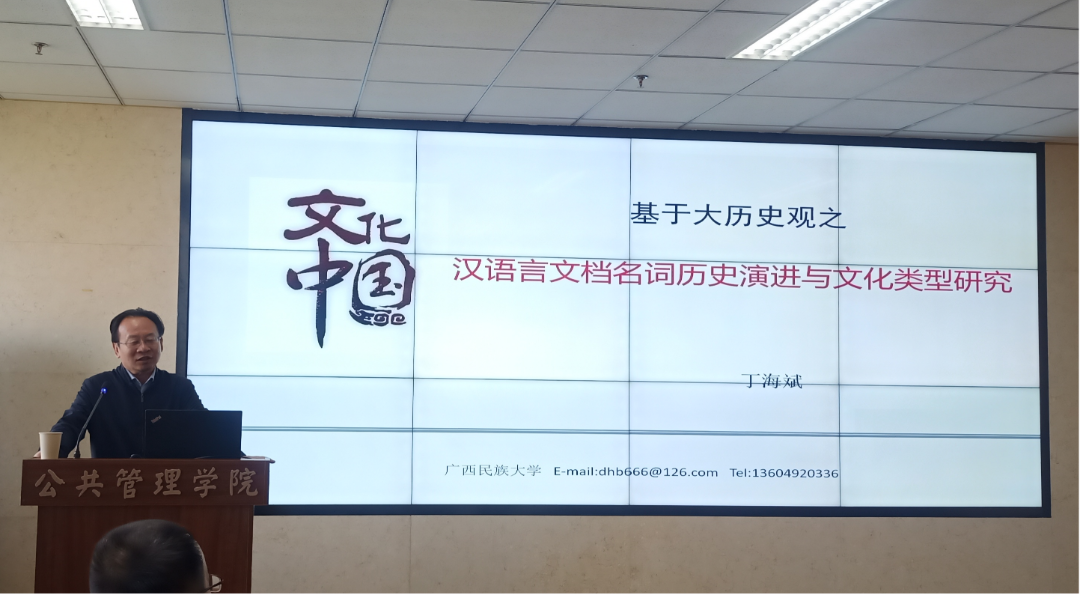 565net必赢2021级档案学班于2023年4月26日09:00于西学楼13层多媒体教室展开4月学风建设主题活动,全班同学参加公共信息资源管理系2023第1期正学报告会。本次活动由黄新荣教授主持,由广西民族大学管理学院丁海斌教授进行“基于大历史观之汉语言文档名词历史演进与文化类型研究”主题报告。