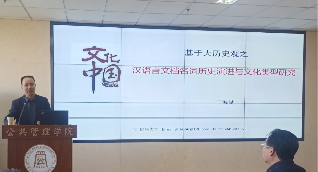 黄新荣教授首先为与会人员介绍了本次报告会的报告人——丁海斌教授。丁海斌,广西民族大学管理学院二级教授,全国档案领军人才、国家级档案专家领军人才、中国档案学会副监事长,数字档案管理与档案服务业研究中心主任,担任《档案学通讯》、人大复印资料《档案学》《档案管理》《档案与建设》《档案》《山西档案》等多家杂志的编委、审稿专家、栏目主持人。长期从事档案学、中国古代史、中国科技史历史语言学等领域的研究,发表学术文章300余篇,出版学术著作30余部。