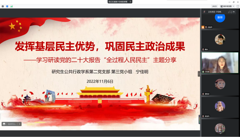 2022年11月7日,研究生公共行政学系第二党支部于西学楼北1607开展“踔厉奋发担使命 勇毅前行谱新篇”主题党日活动。本次主题党日活动由支部书记席祎瀛同志主持,支部全体党员、入党积极分子六十余人参与。