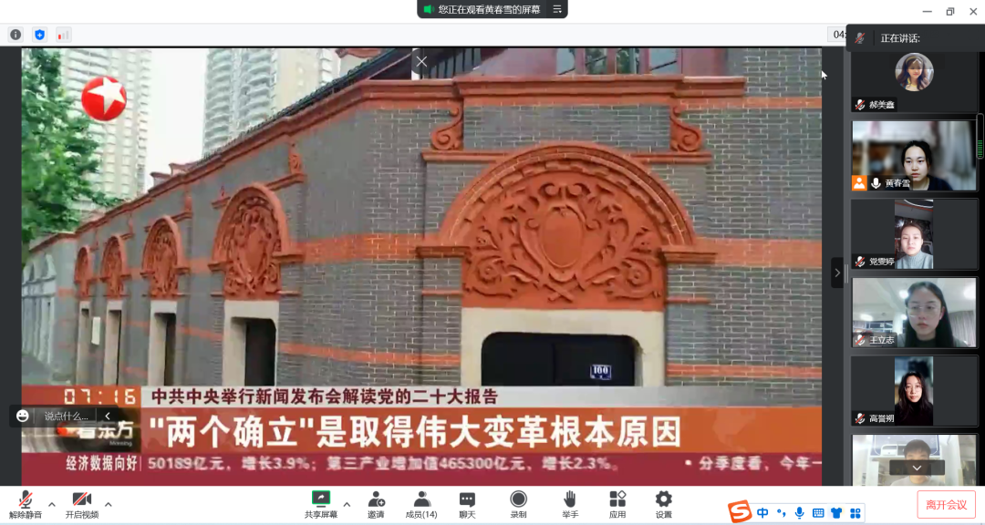 在支部开展主题党日活动之余,各党小组充分发挥集体学习优势,营造集体学习氛围,由党小组组长带领、支部委员协助,线上开展组内党的二十大精神学习研讨会。通过学科视野下对报告内容的深入探讨,各位党员同志深刻领悟了党的二十大报告的时代意涵,再度明晰了当代青年的历史使命与责任担当。