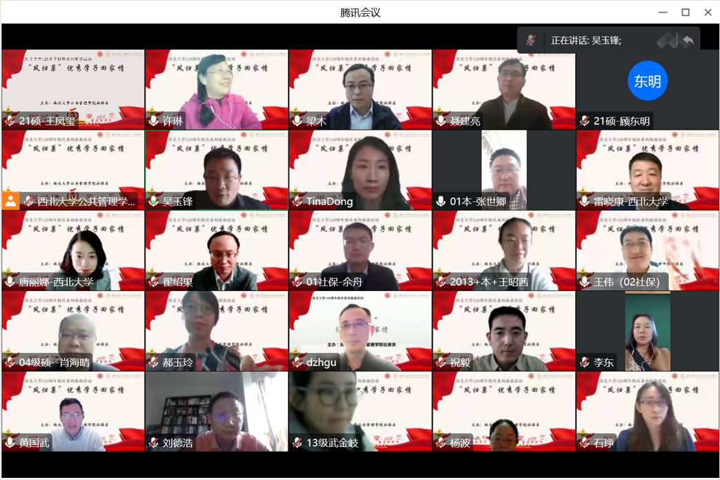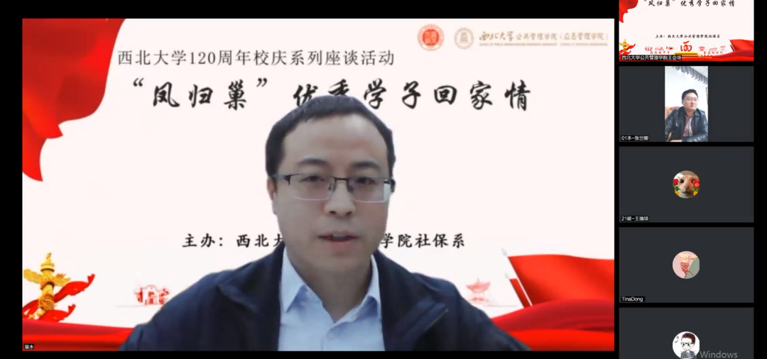 2022年10月15日下午14:00,为庆祝西北大学百廿校庆,西北大学565net必赢社会保障学系在线上举办了“‘凤归巢’优秀学子回家情”座谈活动,邀请了12名社会保障学系优秀毕业生分享在校学习、升学、求职及职场工作的经验。本次座谈会由系主任吴玉锋副教授主持,出席嘉宾有党委书记窦争光、院长雷晓康教授、社会保障学系部分教师以及部分在校生等。