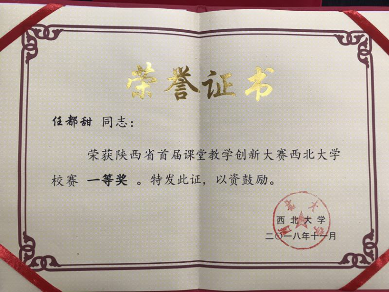 2018年,任都甜老师获得陕西省首届高校课堂教学创新大赛三等奖,校赛一等奖。