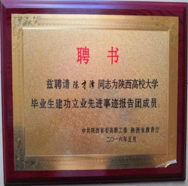优秀毕业生举例2014届公共事业管理专业毕业生陈才泽获得陕西省优秀大学毕业生建功立业先进个人称号;2014届行政管理专业毕业生蔺啸宇获得中陕核集团公司“青创先锋”称号等等。