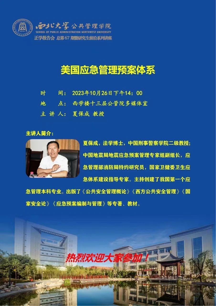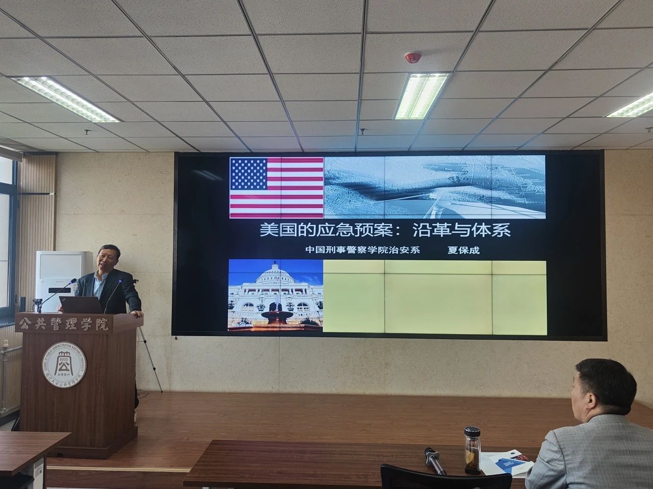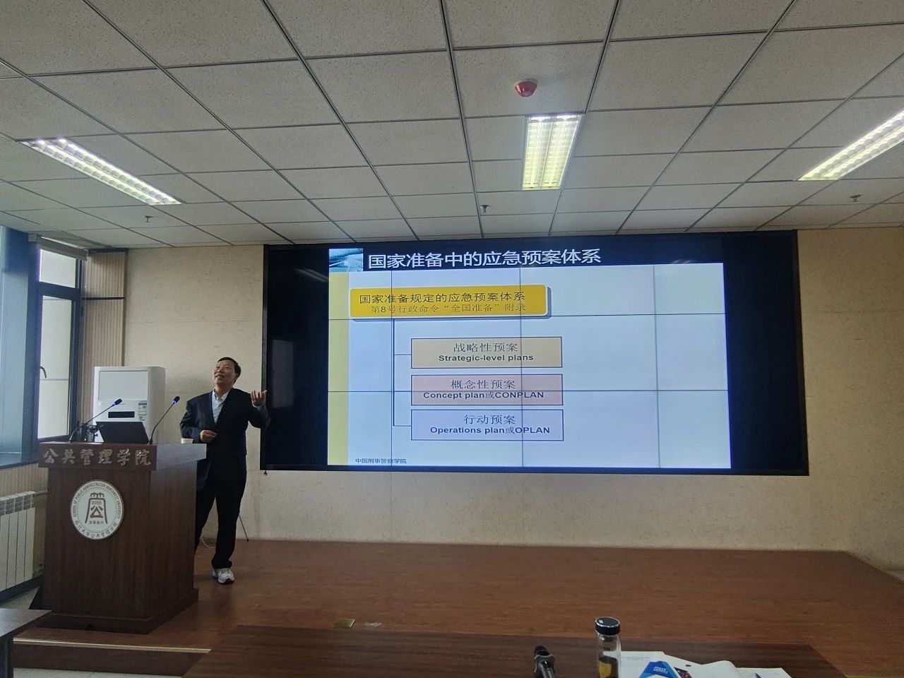 2023年10月26日,我院邀请中国邢事警察学院二级教授,中国地震局地震应急预案管理专家组副组长夏保成教授莅临我院作《美国应急管理预案体系》的学术讲座。本次讲座由院长雷晓康教授主持,教师代表以及院本科生、硕士生参加了讲座。