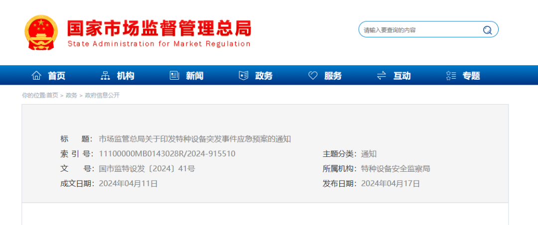 应急政策 | 市场监管总局关于印发特种设备突发事件应急预案的通知