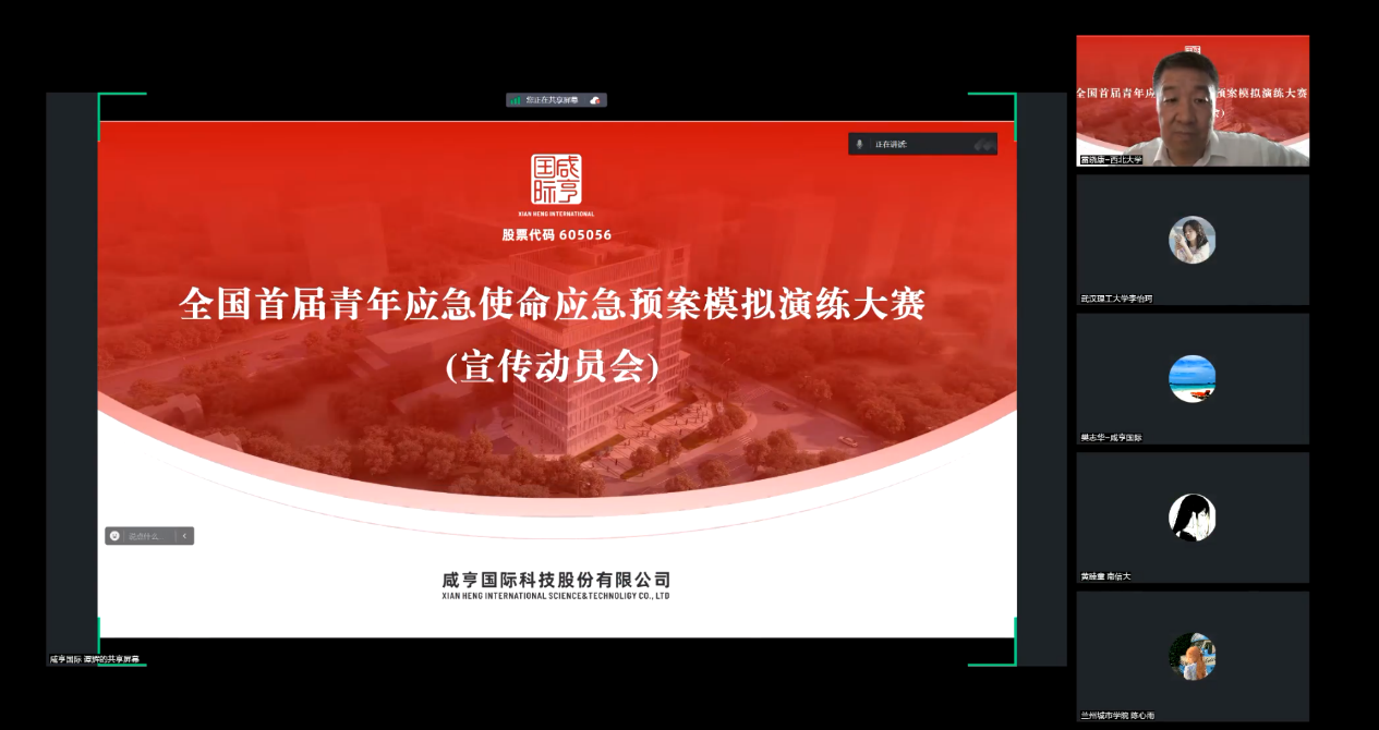 2024年8月8日上午,由应急管理本科专业高校联盟、西北大学主办,西北大学应急管理学院承办,防灾科技学院、华北科技学院、河海大学、河南理工大学、暨南大学、南京师范大学、南京信息工程大学、石河子大学、武汉理工大学、湘潭大学、中国地质大学(武汉)、中国矿业大学等高校协办,咸亨国际科技股份有限公司提供技术支持的“赛孚杯”全国首届青年应急使命应急预案模拟演练大赛的宣传动员会通过在线方式顺利举办。共有来自不同高校的200余名师生参加了会议,会议由西北大学应急管理学院院长雷晓康教授主持。