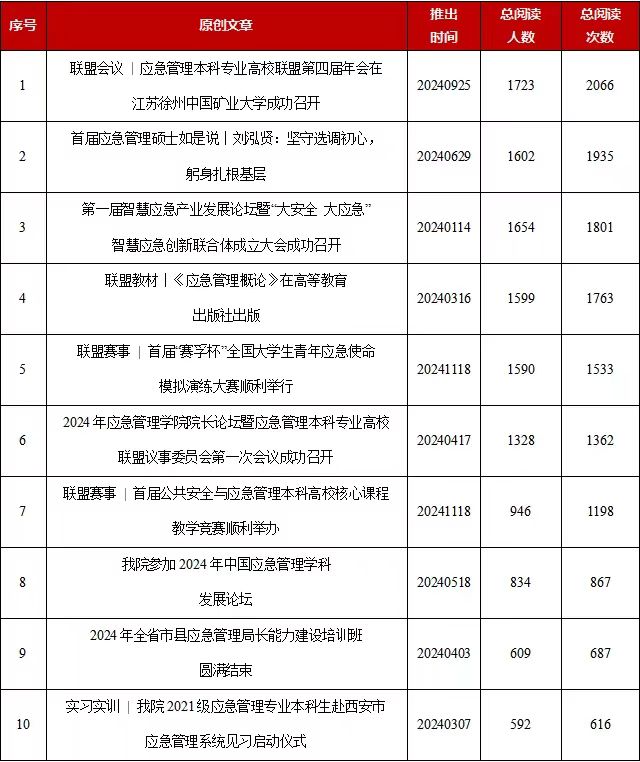 2024年,是新中国成立75周年,是实现“十四五”规划目标任务的关键一年。在“全灾种、大应急”工作格局下,西北大学应急管理学院在学院领导班子的带领下,持续推进“新文科”背景下的应急管理学科交叉建设,不断创新人才培养模式。在学科建设、产学融合、学术交流、人才培养等方面取得一系列成绩。2024年,“西大应急”共推出160期推送,累计阅读量为19.7万次;截至2024年12月29日累计关注人数3791人,对比2023年12月31日新增798人。在辞旧迎新之际,我们推出《“数”说2024》特别栏目,以图文并茂的形式对一年的工作进行分类盘点,为您呈现“西大应急”微信公众号2024年度的工作开展情况。
