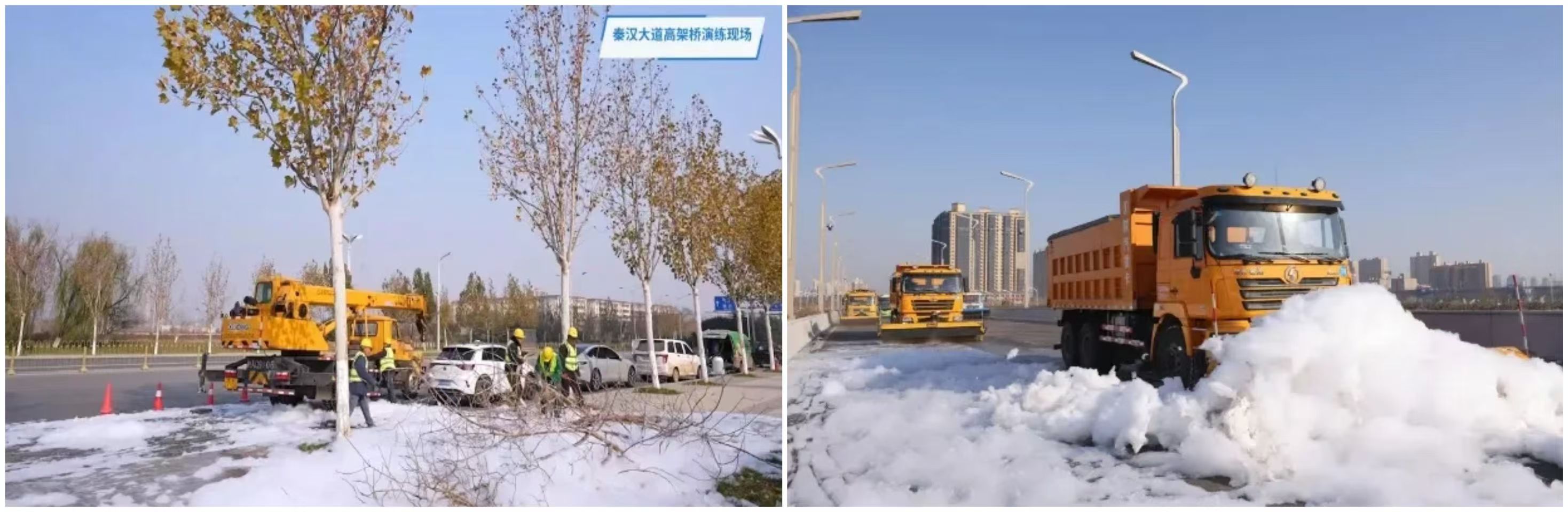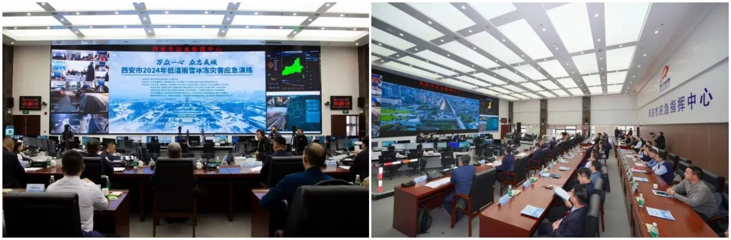 随后以情景预设加实战相结合的方式进行,保持一个指挥中心,两个演练现场三地联动。演练模拟了西安市遭遇“寒潮”,出现大范围、持续性低温雨雪冰冻天气过程,期间发生道路结冰、旅客滞留、民生基础设施受损及垮塌、围困、交通事故等自然灾害和突发事件。在市指挥部的统一协调指导下,驻陕央企国企、省属国有企业与市区两级“跨层级”协调,公安、交通、城管、应急、消防等行业之间“跨部门”协同,政府救援队与社会救援力量之间“跨地域”协作,多点险情处置、重点民生保障、社会面管控等重大措施“跨领域”联动。
