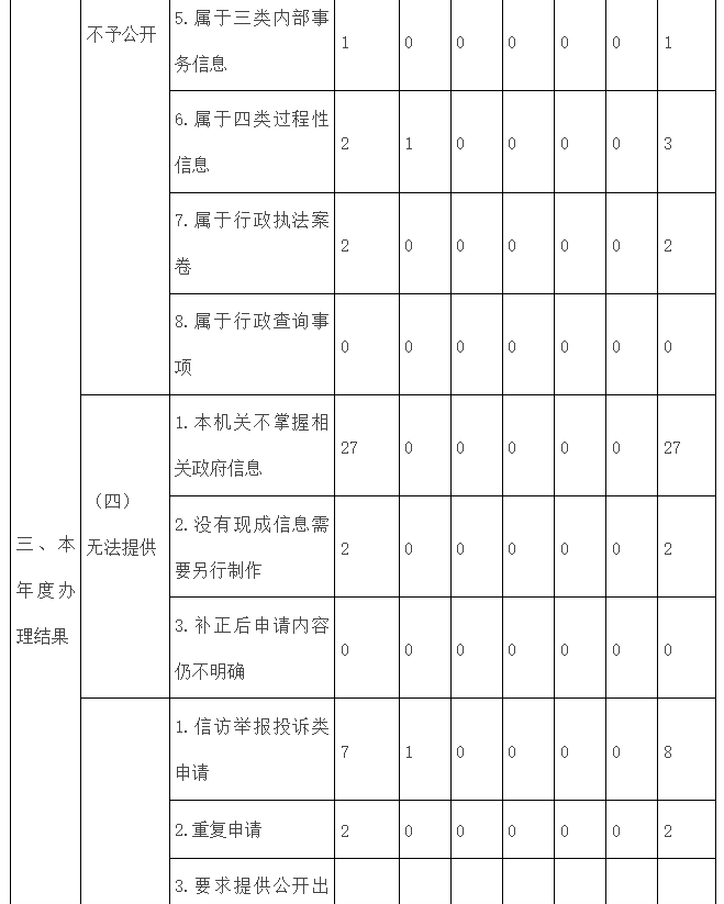 (二)依申请公开方面。全年共办结政府信息公开申请185件,同比增长26%。从申请主体看,公民申请占94%,法人或其他组织申请占6%;从申请形式看,网络申请占57%,邮寄申请占43%;从申请内容看,主要围绕事故灾害调查处理、事故灾害统计分析、应急管理行政执法、安全生产失信主体、安全评价等方面;从办理结果看,予以公开62件,部分公开1件,不予公开12件,无法提供29件,不予处理10件,其他处理71件(其中32件为办理过程中主办司局经电话沟通解决申请人相关诉求后,申请人提交撤销申请,提前终止办理程序) 。