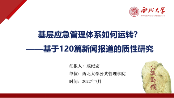 “基础不牢,地动山摇”,基层是国家应急管理体系的“神经末梢”,也是构成应急管理体系顶层设计的重要环节,2020级行政管理硕士研究生成纪宏同学在平行分论坛2作了题为《基层应急管理体系如何运转?——基于120篇新闻报道的质性研究》的报告。根据中国知网关于基层应急管理的新闻报道,采用扎根理论的研究方法,利用Nvivo12软件进行编码分析,从120篇文本中提取了1450条初始语句,形成了46个副范畴和3大核心范畴,构建了基层应急管理体系的运转的“驱动—主体—保障”模型。研究发现,在推动各级应急管理机构改革的进程中,基层应急管理体系在驱动因素、主体因素、保障因素的共同影响下实现良性运转。同时,在各种因素的复合影响下,基层应急管理更加重视端口前移而非被动应急。文章阐释了基层应急管理体系运转的一般模式,对打通应急管理体系建设的“最后一公里”有积极意义。