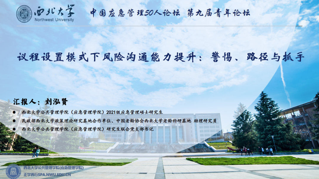 我院2021级应急管理硕士研究生刘泓贤在平行分论坛1作了题为《议程设置模式下风险沟通能力提升:警惕、路径与抓手》的报告。首先,刘泓贤同学运用案例分析法,从议题(舆情名称)、主体(媒介)、时间、影响及相关主体的应对方式(处置结果等维度,系统梳理西安首轮疫情防控期间中的网络议题/舆情,分析议程设置模式下风险沟通能力提升的警惕因素。接着,他针对四重警惕因素,提出议程设置模式下风险沟通能力提升的四条路径。同时他提出可以通过议程设置模式下风险沟通能力提升的四个抓手,即毫不动摇坚持党对舆论工作的领导、风险沟通理论学习与实践应用常态化、网络舆情情景构建强化研判和预警、“一主多副”舆论引导模式强化议程设置管理,一方面可以赋予和激活公共部门的相关制度、政策和举措,为公共部门领导干部搭建风险沟通能力提升的长效机制和平台;另一方面,有助于防范化解网络空间去意识形态化风险,进一步筑牢网络空间安全屏障。