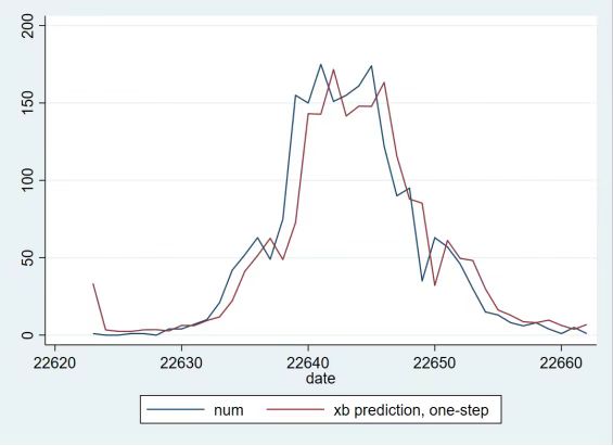 在图3中,右边部分的红线走势就是未来7天的西安确诊病例数量走势,可以发现,红线稍微上升,上升幅度不大,基本不会超过15例。由此可见,在未来一周内,西安确诊病例数量不会大幅上升,西安疫情已经进入向好时期;同时,红线上翘意味着西安确诊病例数量仍有上升风险,需要继续采取必要措施予以防控,不可掉以轻心。