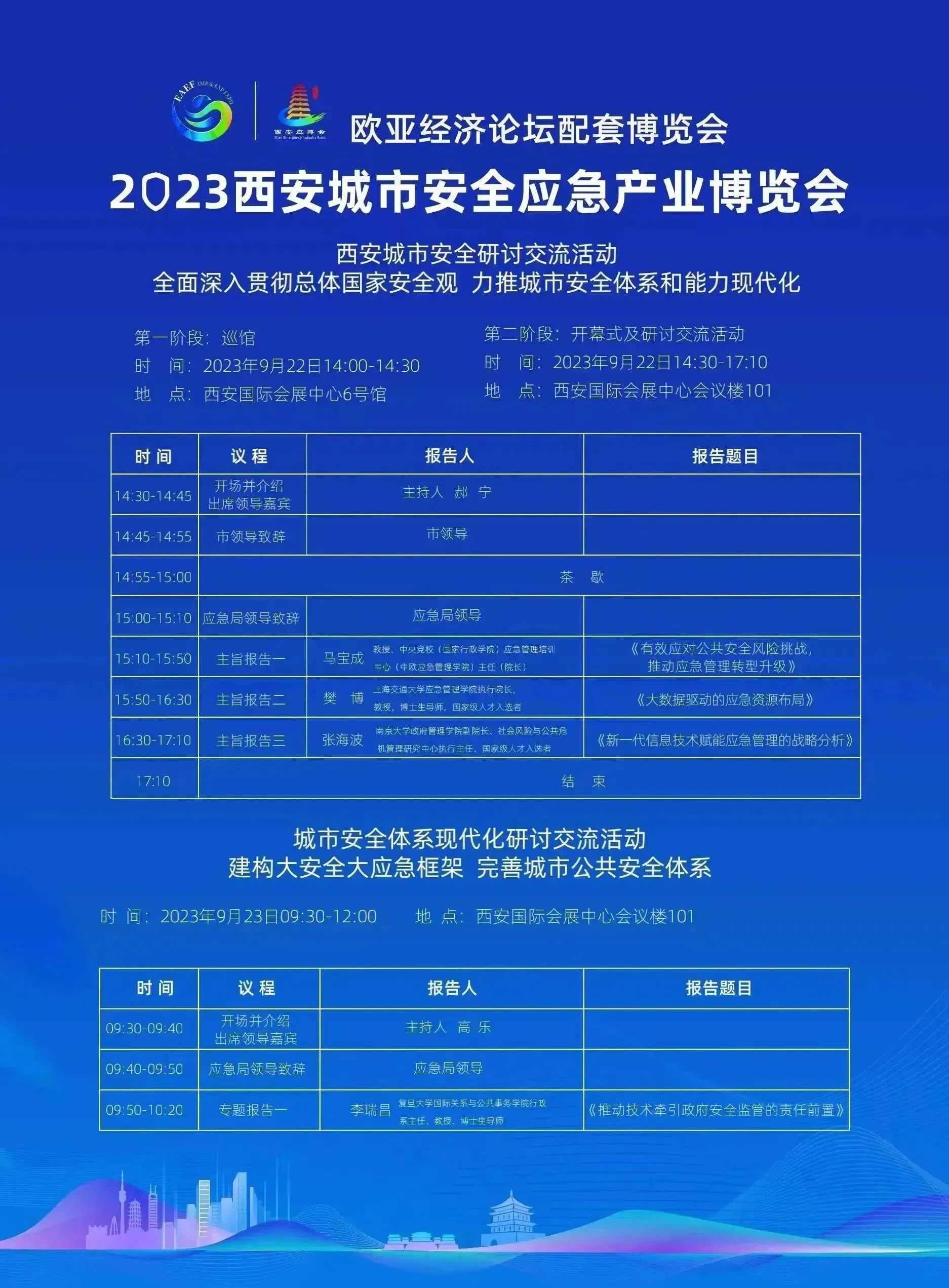 2023西安城市安全应急产业博览会(以下简称西安应博会)定于9月22日-25日在西安国际会展中心举办。作为欧亚经济论坛配套博览会,此次西安应博会由西安市应急管理委员会、西安市安全生产委员会、西安市防灾减灾救灾工作委员会联合主办,西安市应急管理局、西安市博览事务中心承办,西北大学应急管理学院协办。